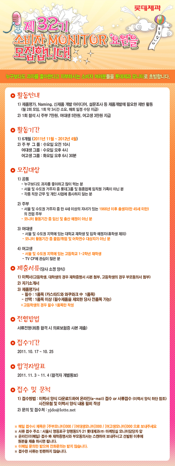 ※ 서류 접수 주소 : 서울시 영등포구 양평동5가 21 롯데제과㈜ 마케팅실 모니터담당자 앞